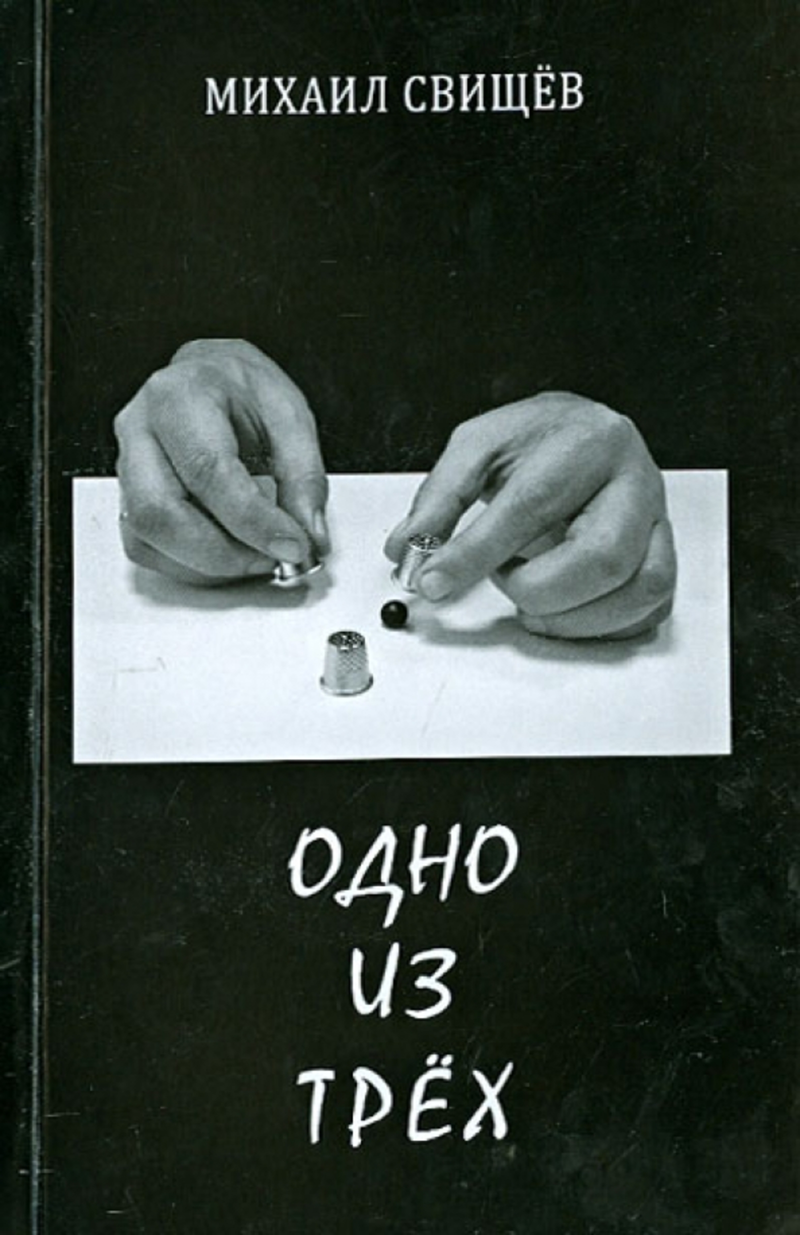 Поражённая сюрреалистичной ситуацией, я не спросила проводницу, по каким признакам она определяет качество книги «с обложки» – а она, проследовав дальше, занялась типовым «проводницким» выговором мужчинам, накрывшим поляну с водочкой, и возвращаться к литературе казалось после этого карикатурно. По оформлению судит девушка, что ли? – подумала я и попыталась другими глазами посмотреть на сборник «Одно из трёх». «Другими глазами» я увидела то же, что и своими: чёрно-белую гамму, бархатно-чёрное поле, в котором на белом прямоугольнике две «серые» (так выглядит без цвета телесность) руки играют тремя напёрстками, отдельно катается чёрный шарик. Сверху, над картинкой, напечатано «Михаил Свищёв», снизу якобы «написано» полупечатными размашистыми буквами: «Одно из трёх». Концепция обложки полностью соответствует названию, но во всём этом присутствует явный символизм. Может быть, именно его прочувствовала столь интересная проводница?.. Ведь она не видела четвёртой страницы обложки, на которой напечатаны стихи вот таким образом: