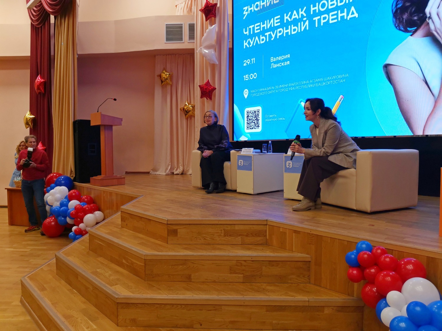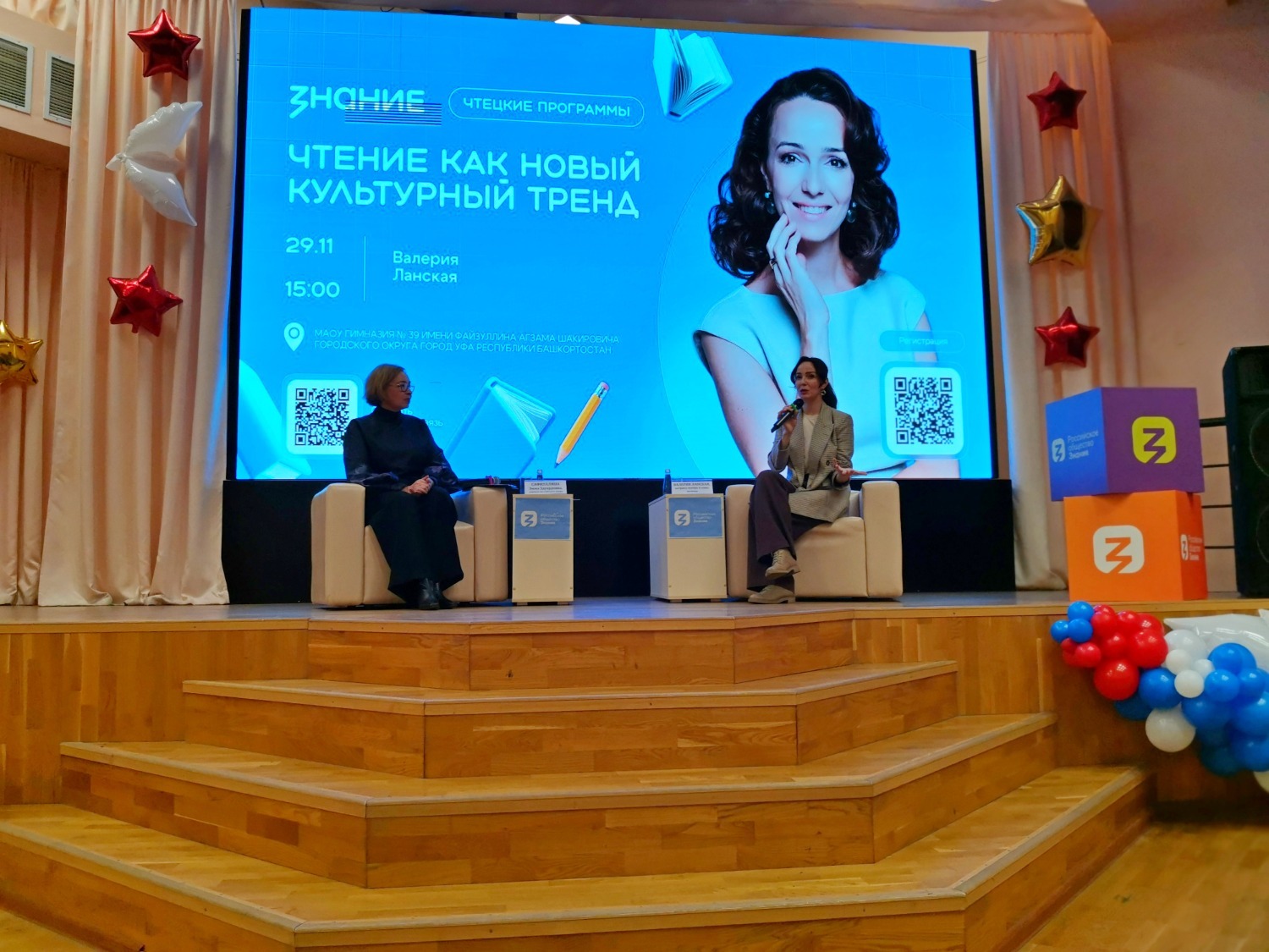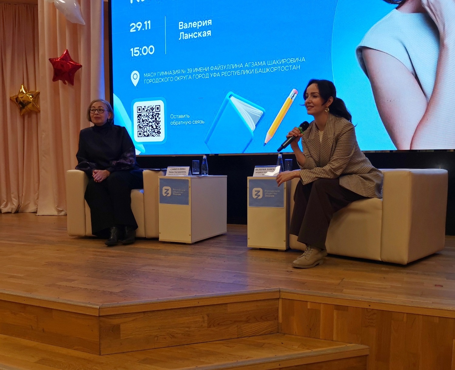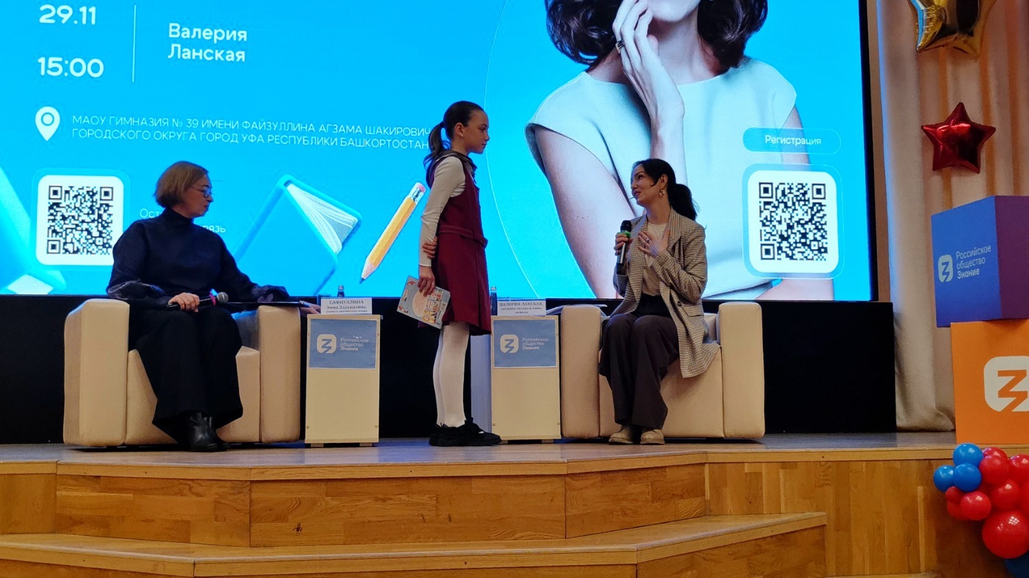 Сегодня в Уфе, несмотря на не зимнюю и хмурую погоду, состоялось довольно милое мероприятие в стенах гимназии №39 им. Файзуллина А.Ш. в ассоциированной школе ЮНЕСКО. На встрече со школьниками лектором Российского общества «Знание» выступила довольно известная актриса театра и кино Валерия Ланская. Она уже давно активно участвует в культурно-просветительских проектах этого общества.