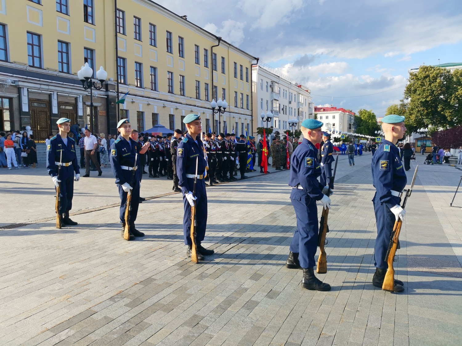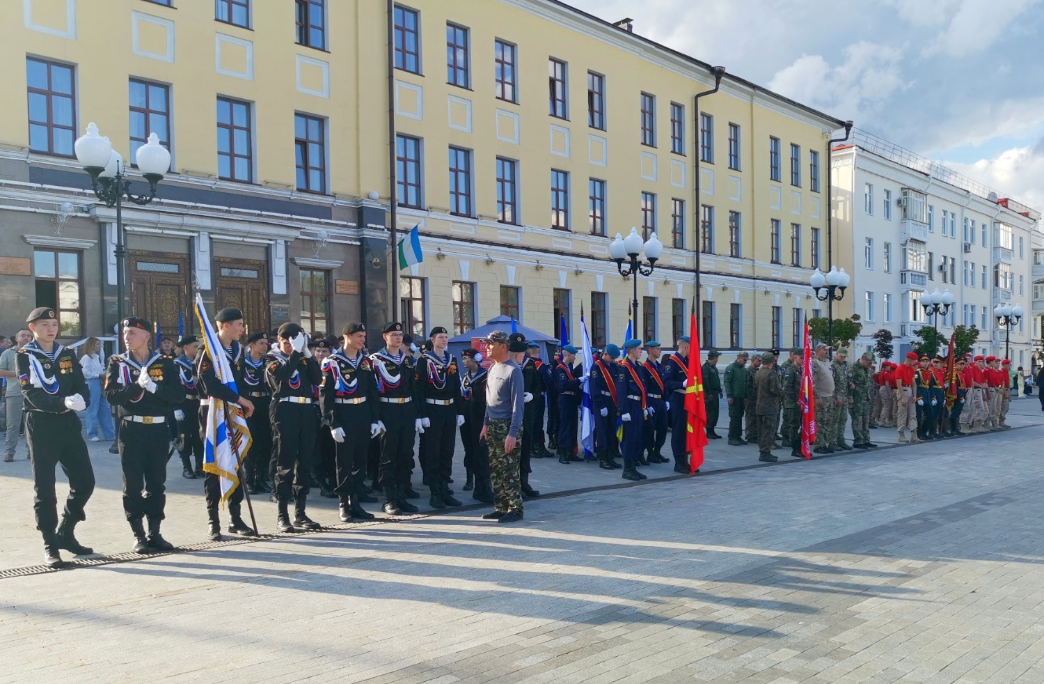 Торжественным маршем прошли воспитанники Региональной общественной организации морских пехотинцев «Витязь» и лучшие представители регионального отделения Юнармии Башкирии. Кадеты-отличники Уфимской школы-интерната с первоначальной лётной подготовкой им. дважды Героя Советского Союза Мусы Гареева гордо держали знамена. В марше также приняли участие ученики специальных классов им. Героя России Минигали Шаймуратова, известные как шаймуратовцы. Каждый год на Советской площади они принимают присягу со словами: «Потомки Салавата отступать не умеют!» На парад были приглашены ветераны Афганистана и Чечни.