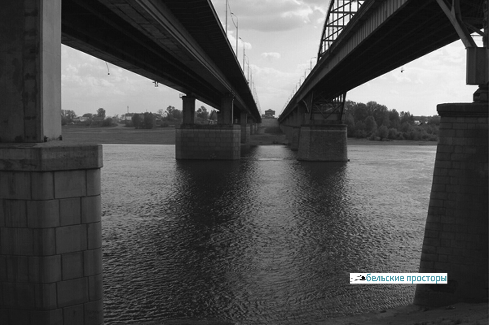 Слева наверху выглядывают из зелени сквера металлические беседки и висячий мостик, а прямо по курсу — мощно нависают поперек реки оба автомобильных моста, старый и новый. Снизу, от воды они смотрятся впечатляюще. Несколько лет назад, неспешно проплывая под этими мостами по течению на спине, я обнаружил, что снизу к ним лепятся гнезда птиц — ласточки? стрижи? Но теперь гнезд не видно.