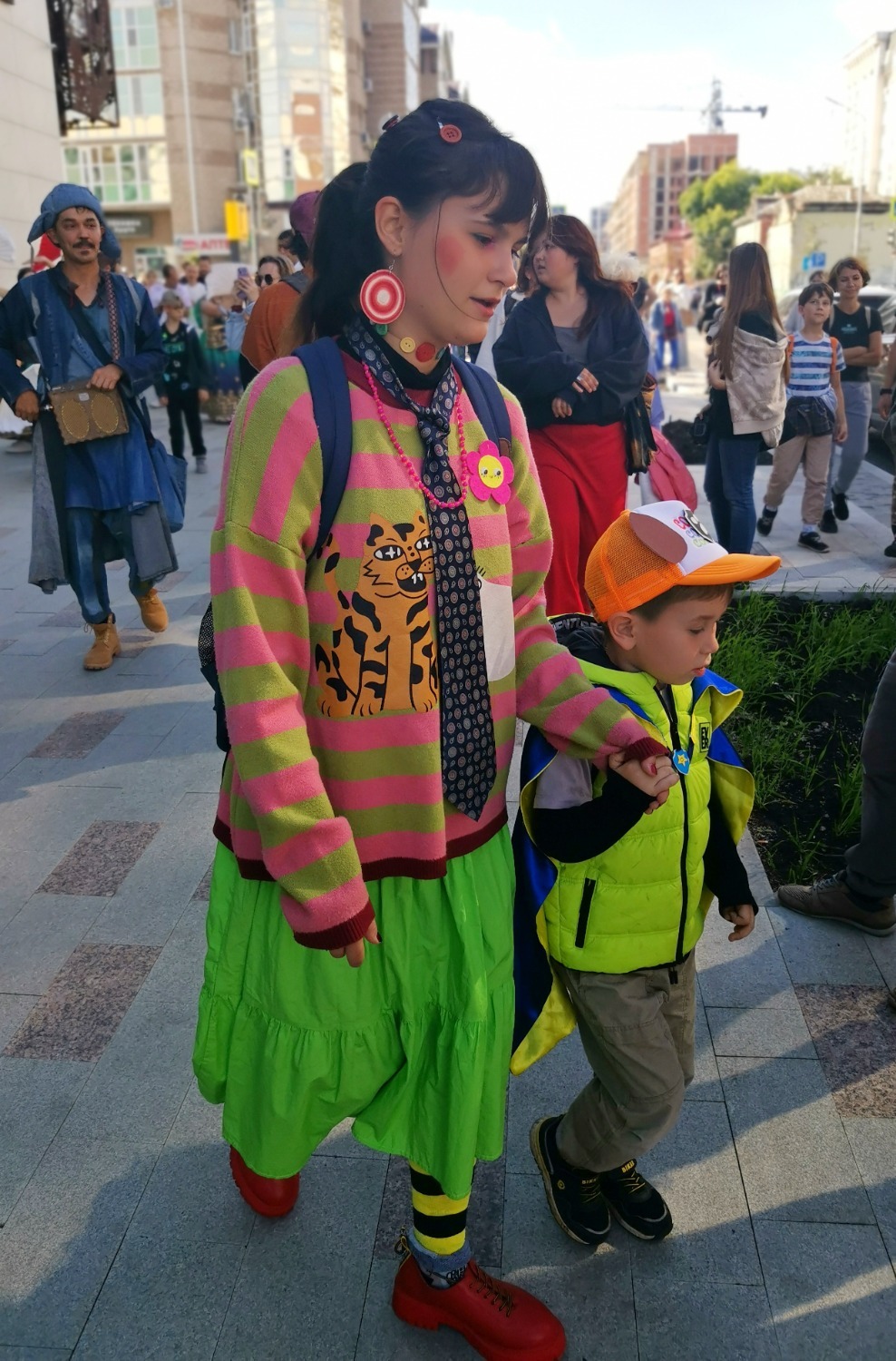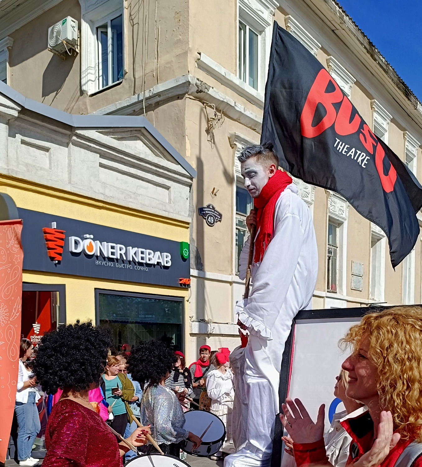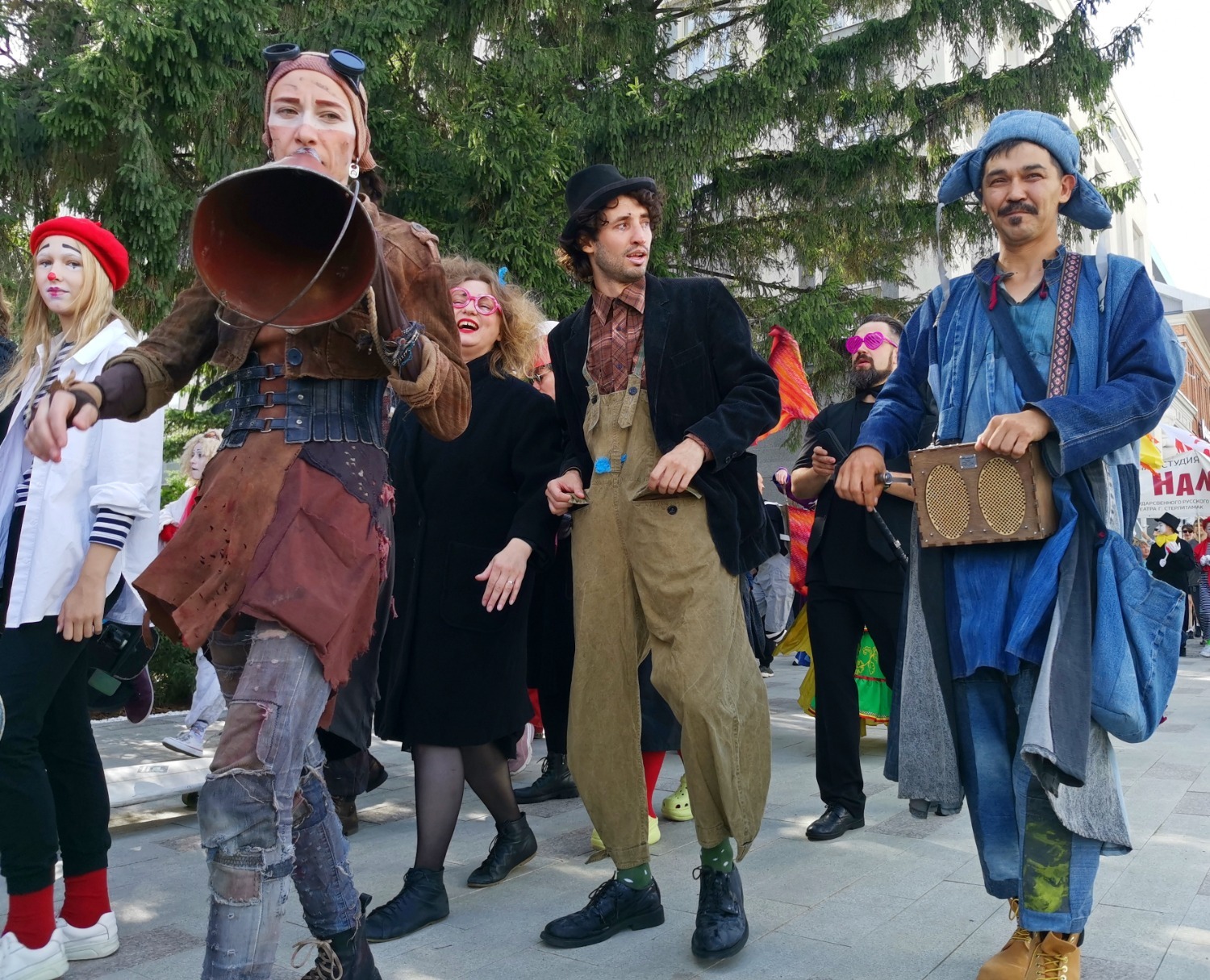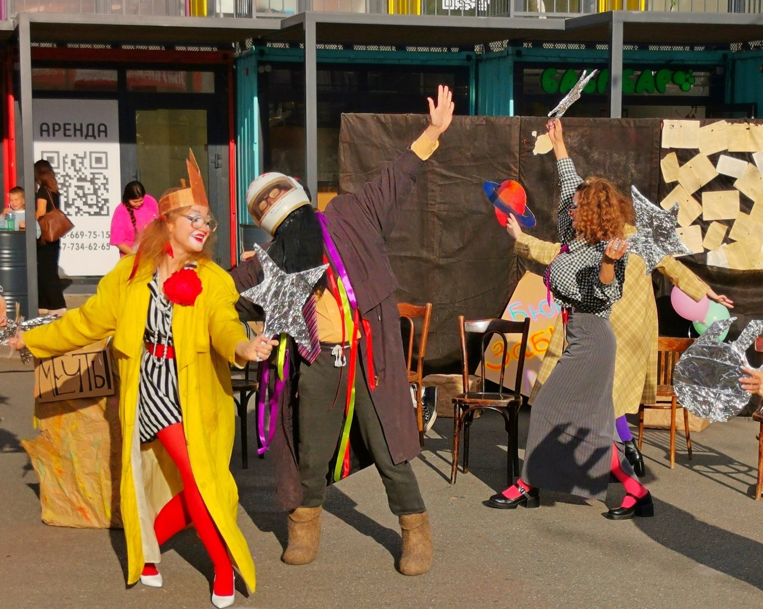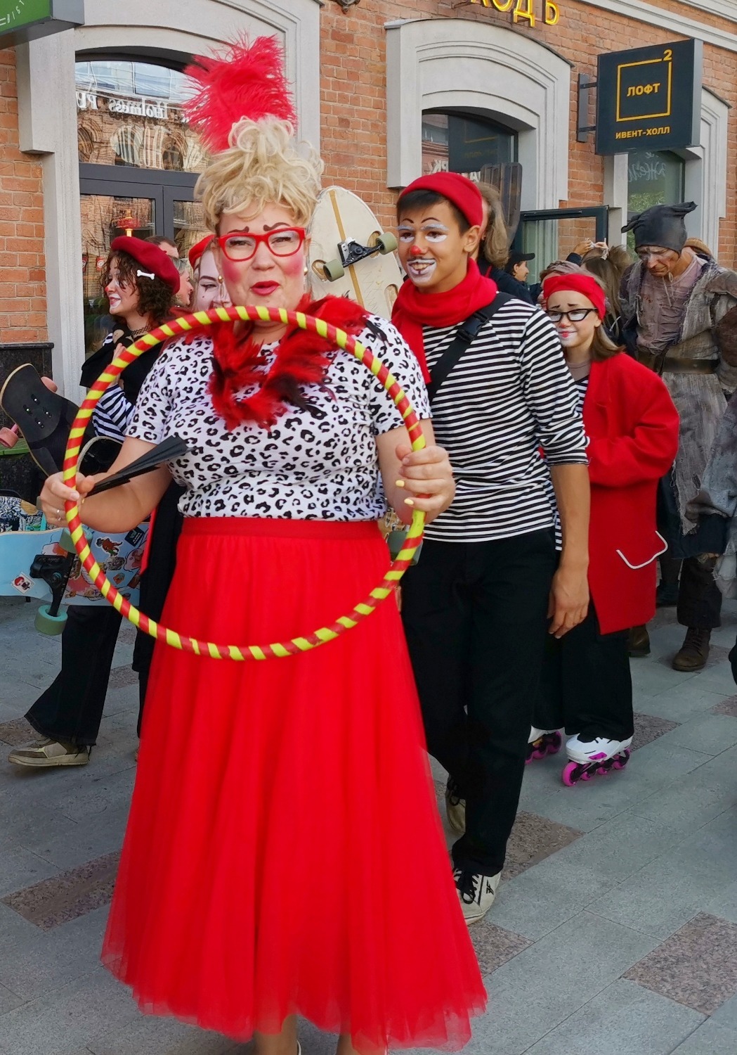 Вчера и сегодня, так сказать, идёт... шёл фестиваль уличных театров. Гип-гоп, ура! Вчера, уже не сегодня, прошло карнавальное, театральное шествие вокруг "Арт-квадрата". Как обычно, как всегда. Автомобили, проезжающие по проезжей части, шарахались в сторону, подальше от праздничной толпы. Не дай бог, кто заденет, помнёт, погнёт их... А толпа ликовала, смеялась от души, танцевала ламбаду, лезгинку и прочие зажигательные танцы. Клоуны, артистичные личности лезли в обнимашки, будто друга родного встретили. Одни словом, это нечто зубодробильное, сногшибательное, сверхфееричное и крышесносное. И спектакли душевные, пронзительные. Театр уличный жив и живее всех! Ур-р-а-а-а!