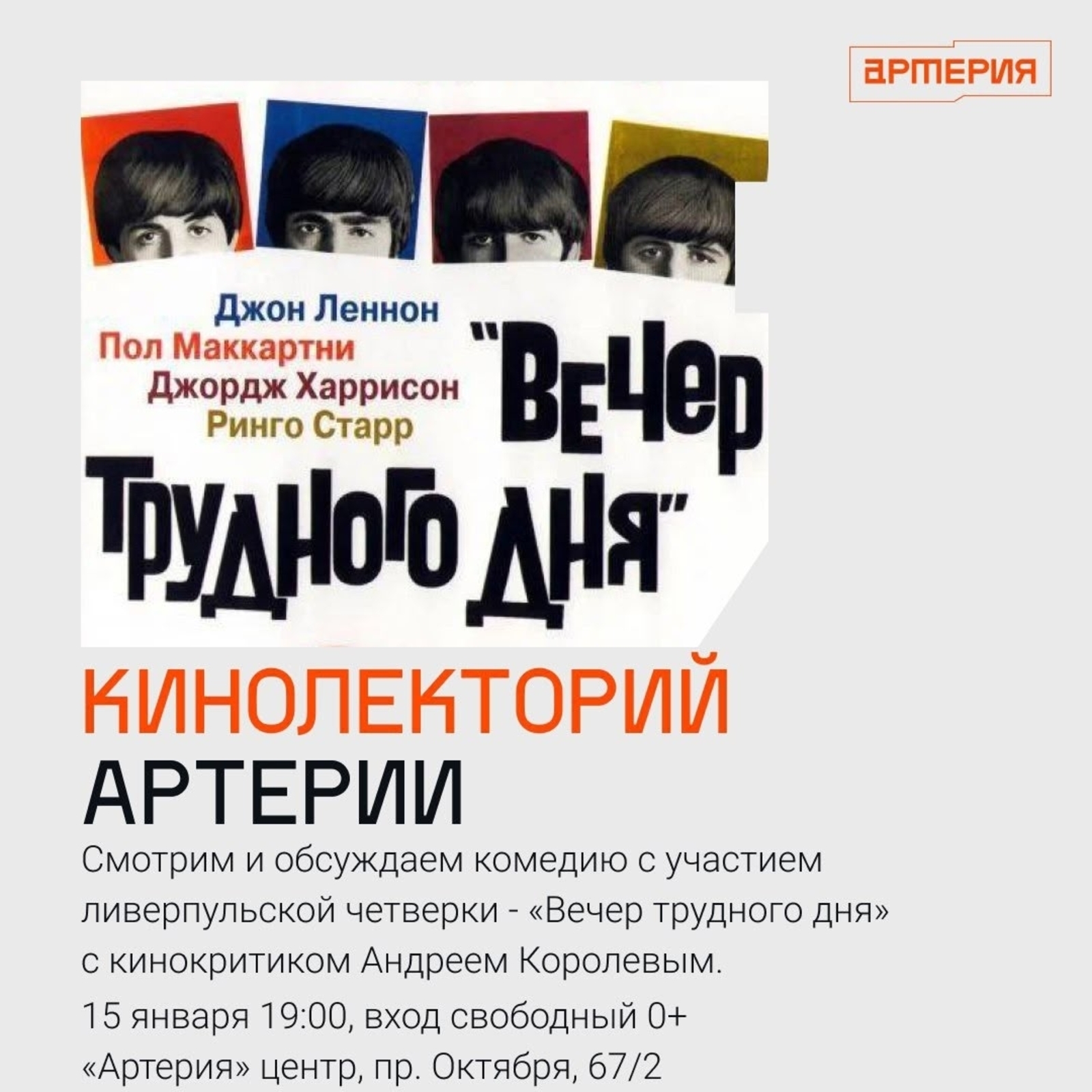 Кинолекторий "Артерии" приглашает на вечер, посвященный ливерпульской четверке. В честь Всемирного дня Битлз мы покажем культовую комедию "Вечер трудного дня" (0+).