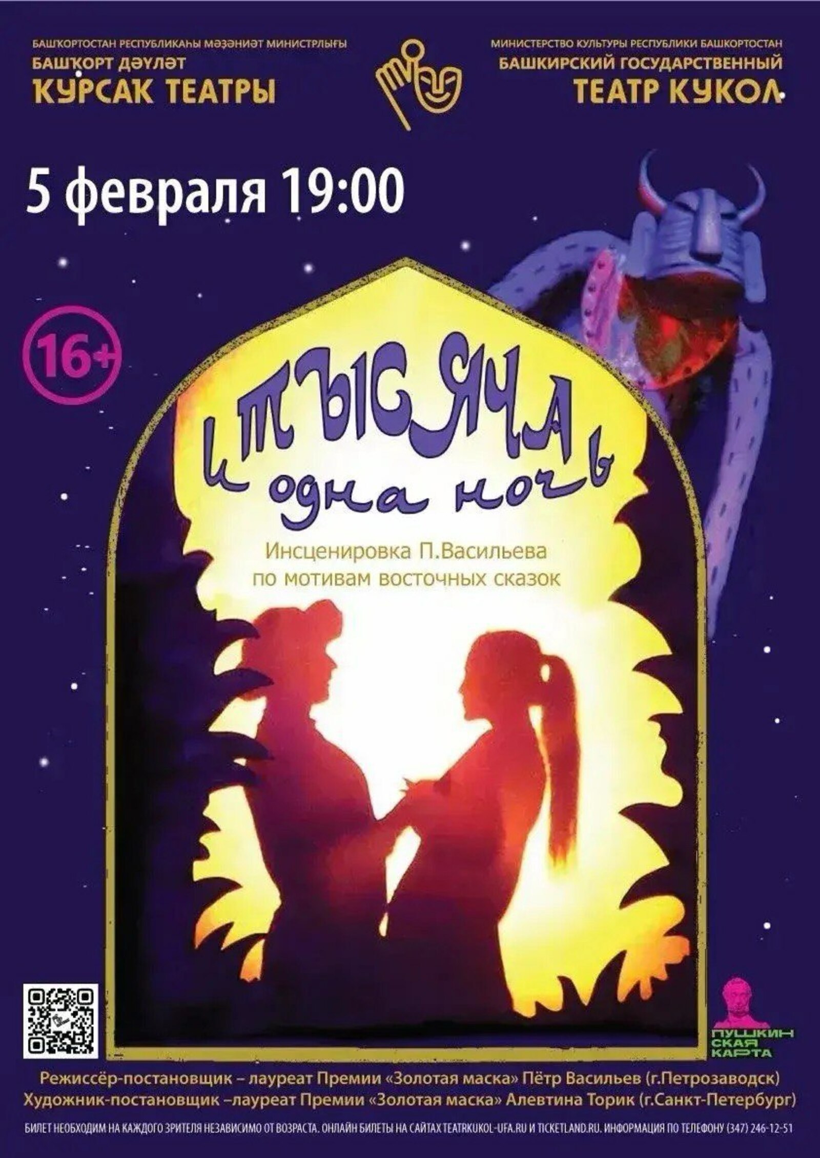 5 февраля Башкирский театр кукол празднует 94-й день рождения. В программе: торжественная часть, розыгрыш подарков и спектакль «Тысяча и одна ночь» для зрителей старше 16 лет. Начало в 19:00.