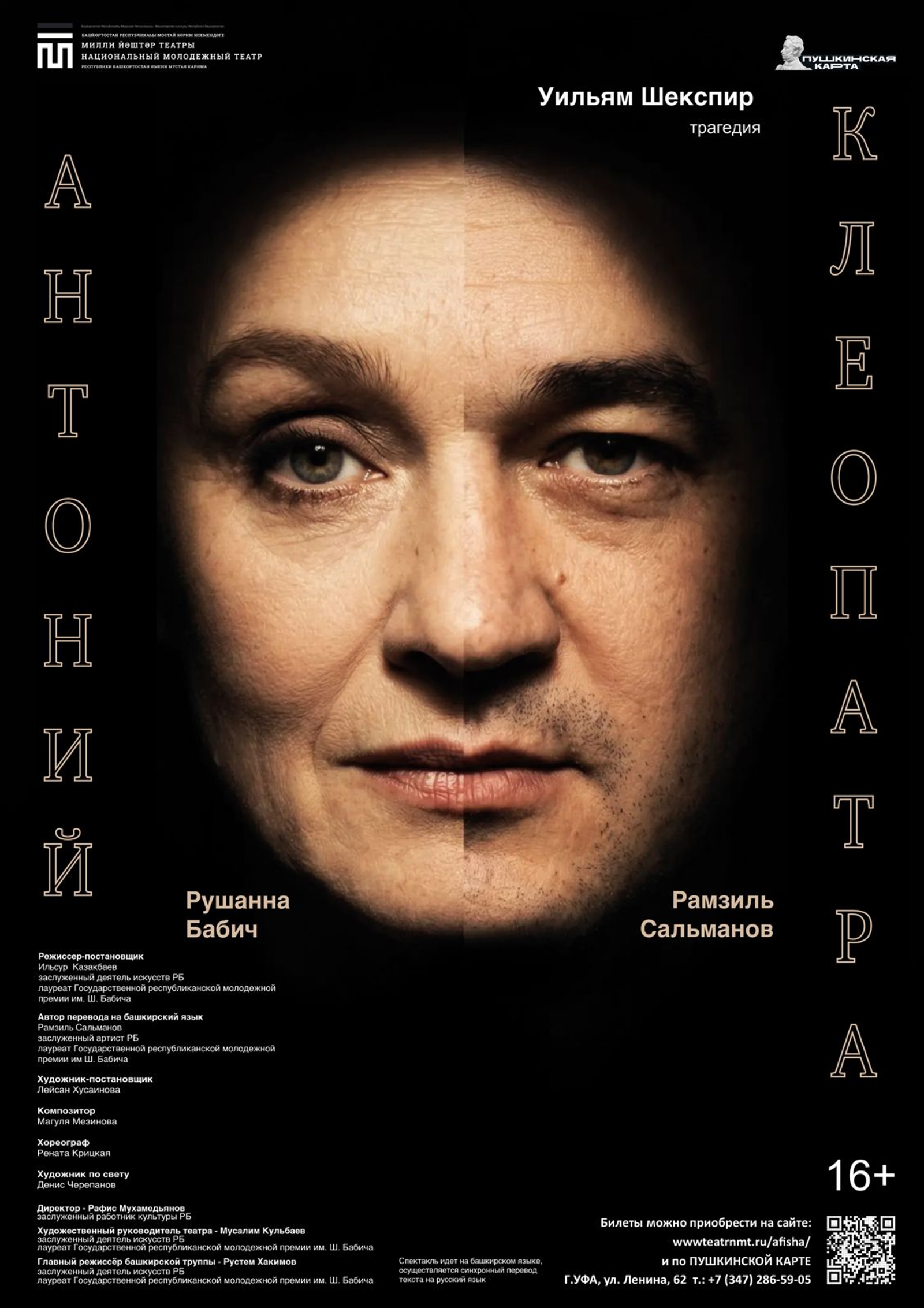 24 апреля Национальный молодежный театр Республики Башкортостан имени Мустая Карима представит премьеру спектакля «Антоний и Клеопатра» по пьесе Уильяма Шекспира. Это бенефисная постановка, приуроченная к юбилею народной артистки Башкортостана Рушанны Бабич.